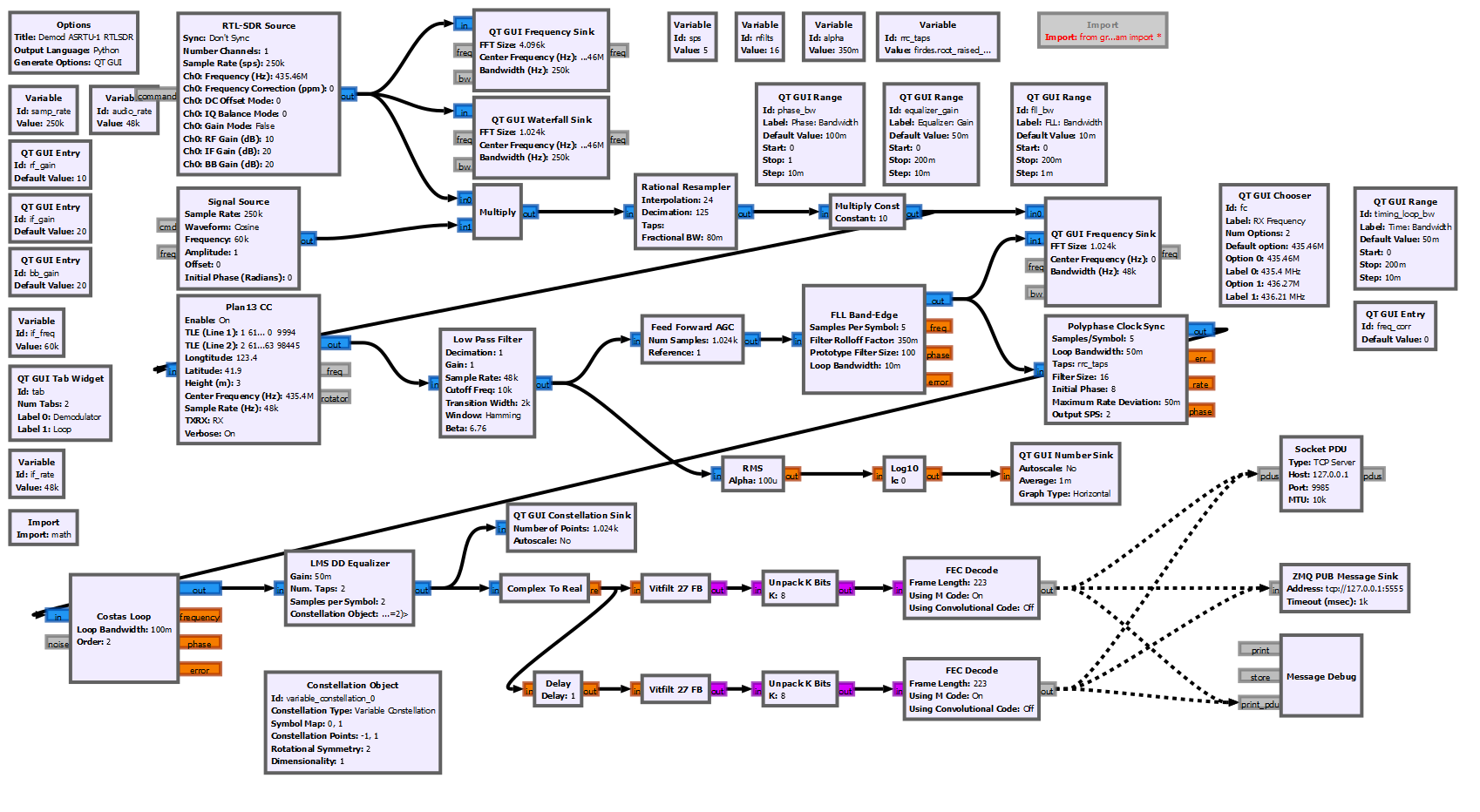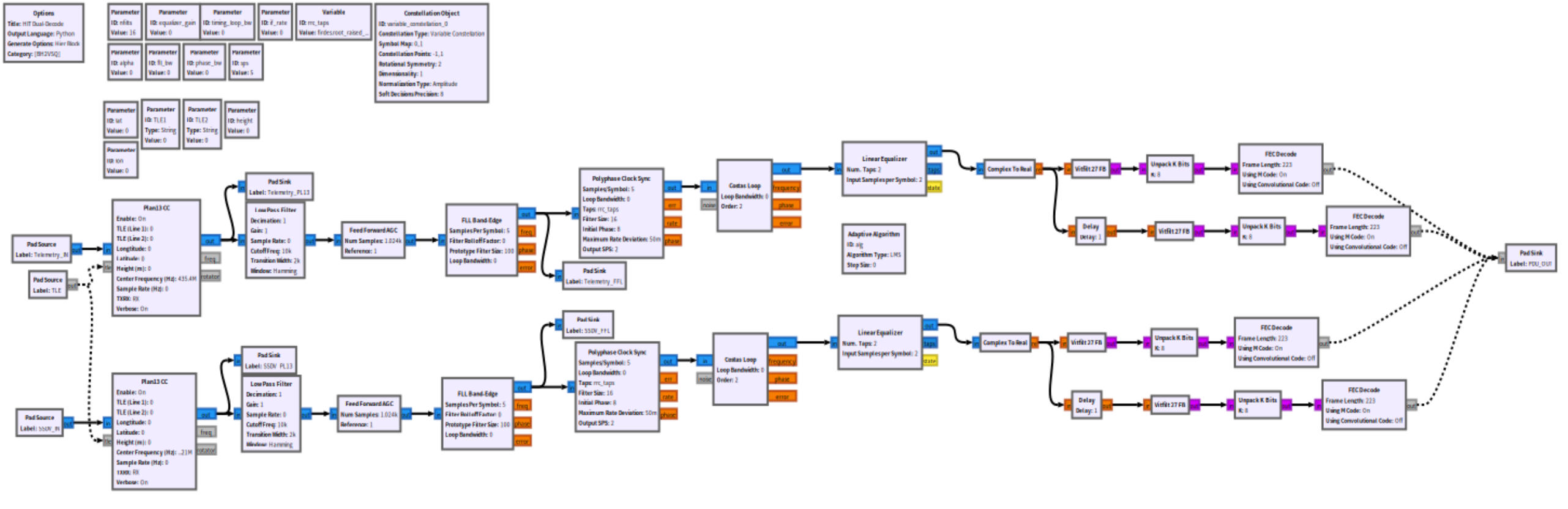 结构为两路解码数据,最终全部送入pad sink,最后在流图中接入PDU块从而输入到解码软件中