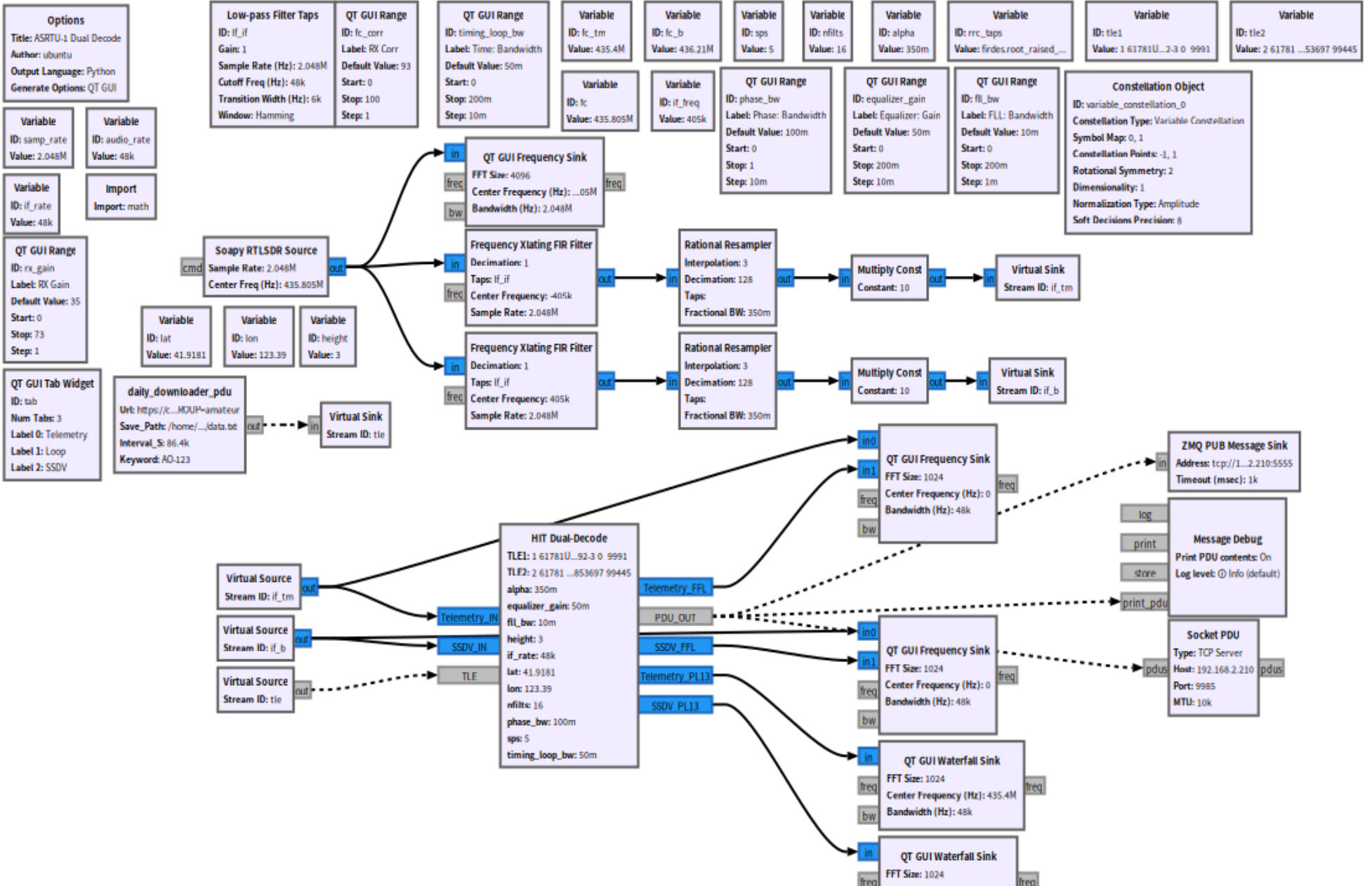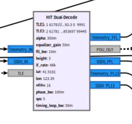 由于该流图的部分块在3.10已经废弃不可用,而且同时只可以选择接收遥测或者SSDV而不能同时接受两个信号,故我有了将两个频点的信号接收做在同一个流图中,这样子就可以从RTL的频带内同时获取SSDV和遥测的数据包