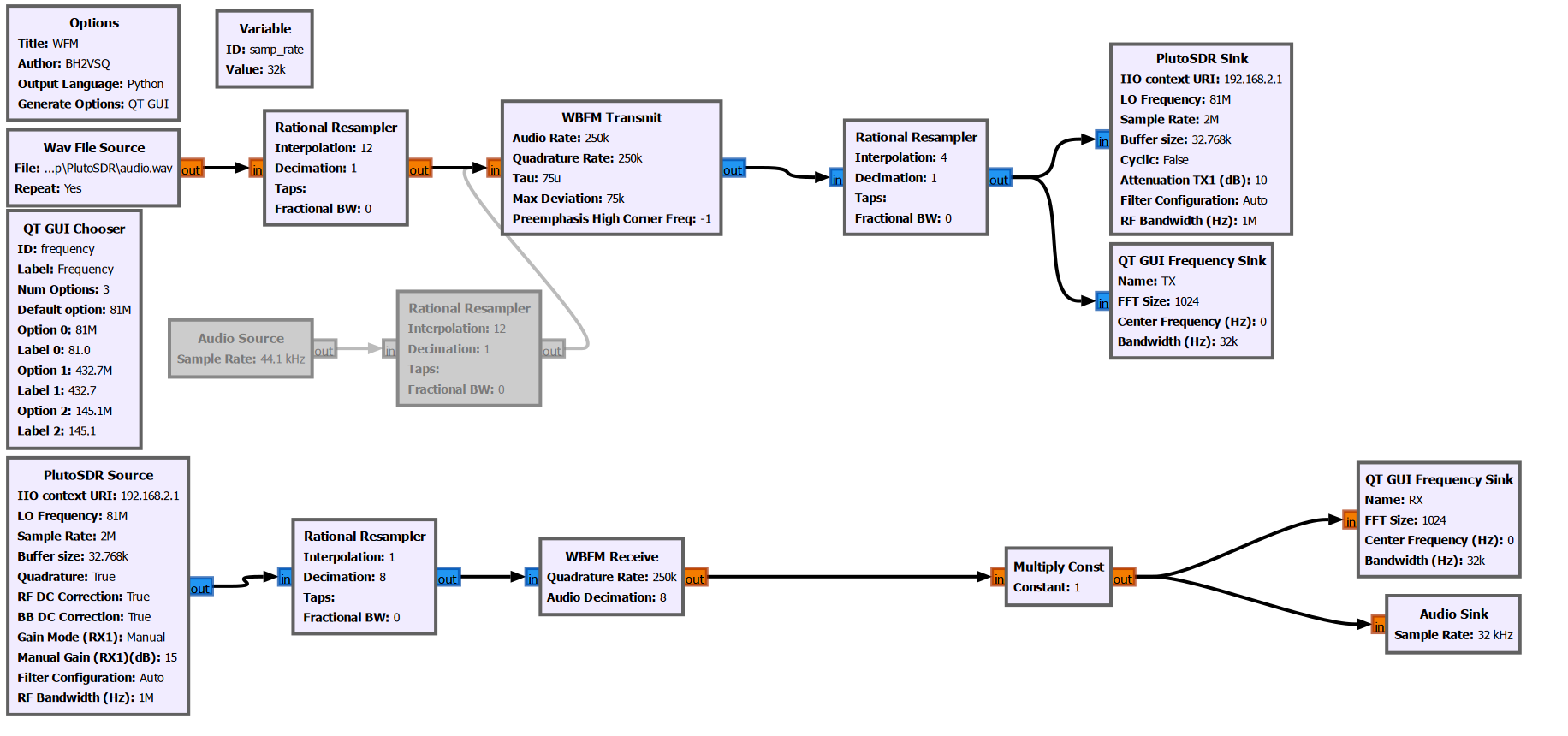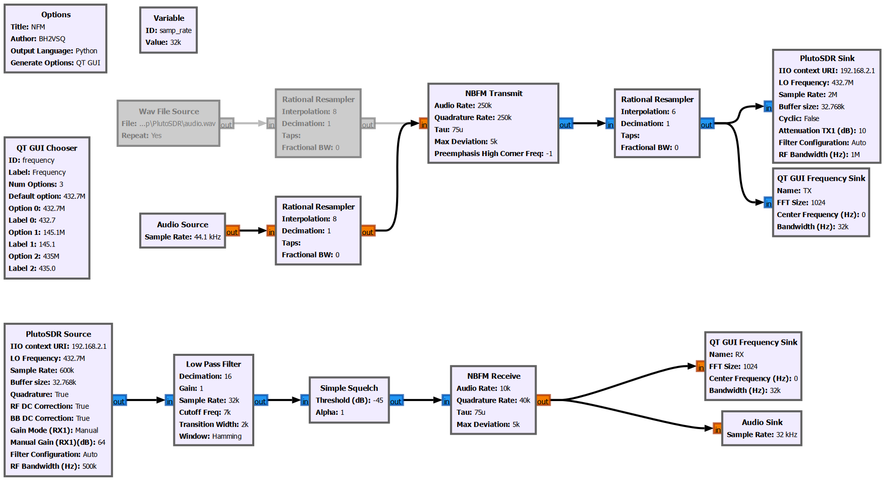 流图中实现了: 1.可调频率发射,通过修改QT GUI Chooser的选项修改预设频率 2.可控输入音频,既可以输入WAV文件,也可以通过Audio Sink输入麦克风音频实时发送 3.回流解码:通过Pluto的RX端口接入将信号重新解码为音频通过扬声器外放出来